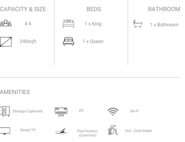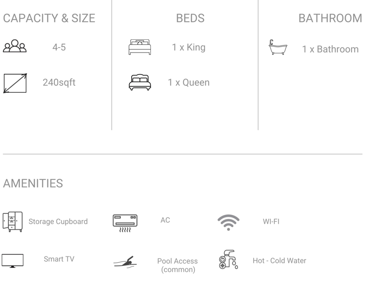 Glass house 1 has Two separate bedrooms and one common washroom, best suited for family of 4 or Two couples.Two different entrances for better privacy