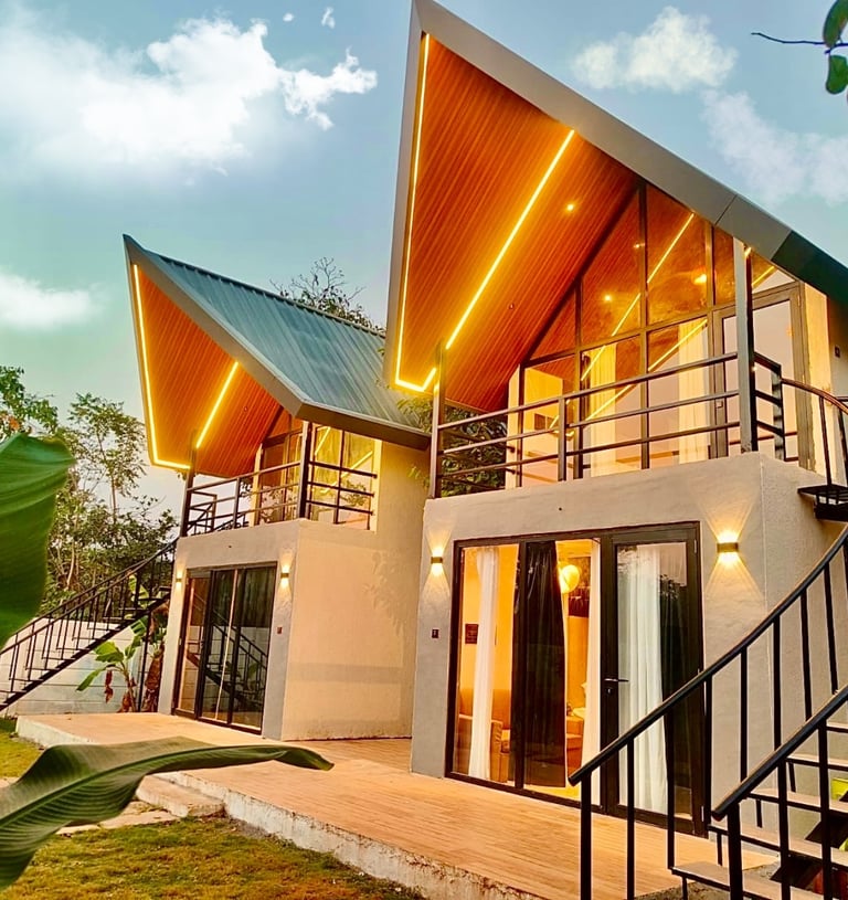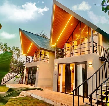 Experience luxury in our glass houses and wooden cottages surrounded by lush greenery and tranquility.